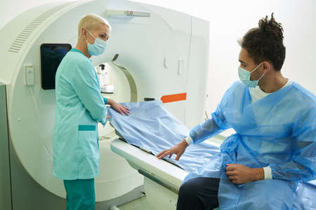 Man visiting modern hospital for tomography examination