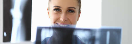 Woman doctor in office holds an xray closeup