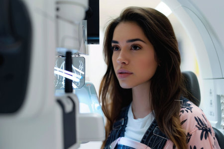 Young woman undergoing an eye examination with specialized equipment in a modern clinic
