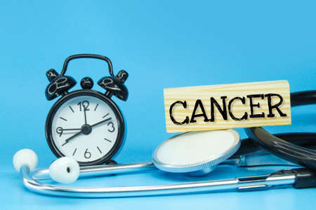 Stethoscope, alarm clock with the word cancer on a wooden board