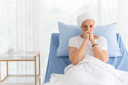 Side view of senior breast cancer patient wearing a headscarf laying in bed and praying in the hospital room, cancer concept