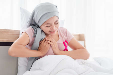 Young asian women wearing hijab Hands held on the chest due to pain while sitting in bed. Indicates recovery from breast cancer Breast cancer concept, cancer prevention concept.