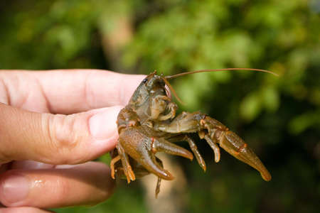 Nature Concept. Woman's hand holds alive crayfish.