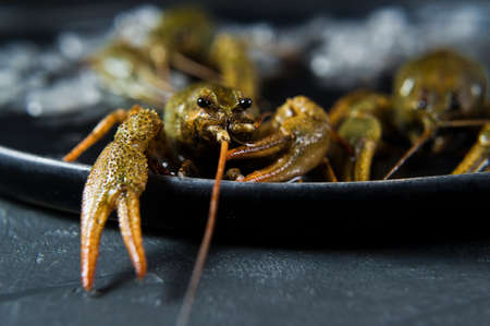 Live crayfish on a plate of ice. Black background, side view, space for text