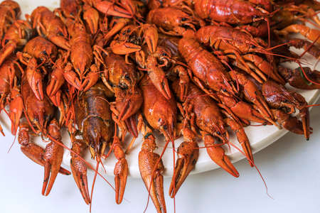 boiled red crayfish background for menu. top view, close up photo. a plate of cooked crayfish.
