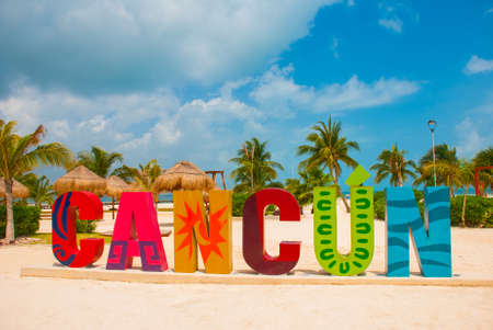 Cancun, Mexico, inscription in front of the Playa Delfines beach. Huge letters of the city name.