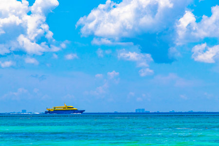 Playa del Carmen Quintana Roo Mexico August 05, 2023 Boat yacht catamaran ship ferry jetty pier and harbor at the tropical Mexican Caribbean beach panorama view and turquoise blue water in Playa del Carmen Mexico.