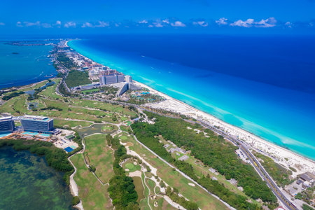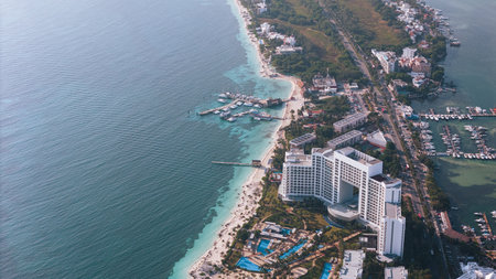 Aerial panoramic view of Cancun city hotel zone in Mexico. Caribbean coast landscape of Mexican resort with beach Playa Caracol and Kukulcan road. Riviera Maya in Quintana roo region on Yucatan Peninsula