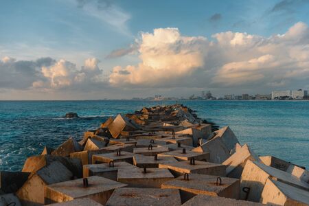 Breakwater made of concrete slabs on the Caribbean Sea. Cancun.