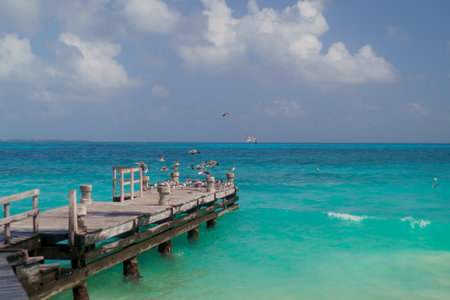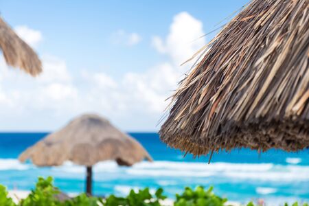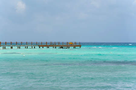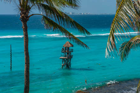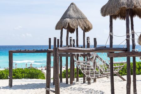 CANCUN, MEXIICO - MARCH 10.2021: The pier of Playa Tortuga - turtle beach with a thatched roof building