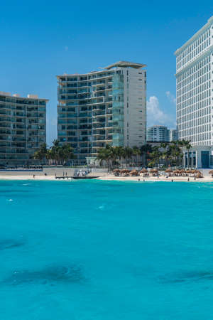 View from the sea to buildings and the hotels of Cancun. Mexico.