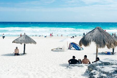 Unrecognizable beachgoers flock to the tropical beaches of Riviera Maya near Cancun, Mexico, during the popular Winter getaway to the Caribbean coast.