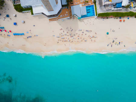 Generative AI : Aerial view of people on the beach along the shoreline with hotel buildings in Palm Beach in Aruba