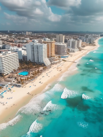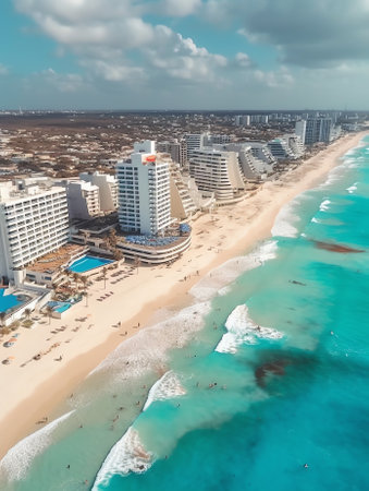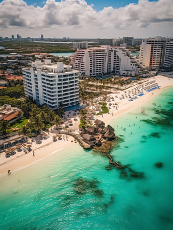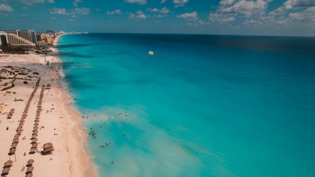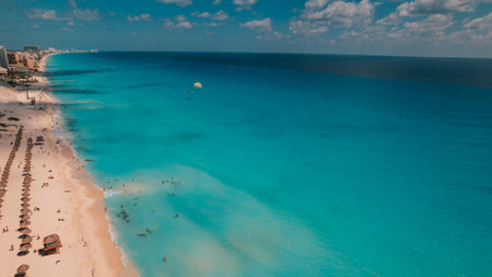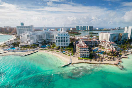 Aerial view of beautiful sandy beach and turquoise sea in Cancun, Mexico. Paradise for tourists