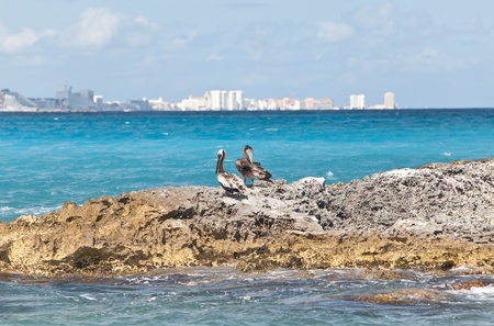 seagulls on old gray logs against a blue sky. Isla mujeres, mexico.
