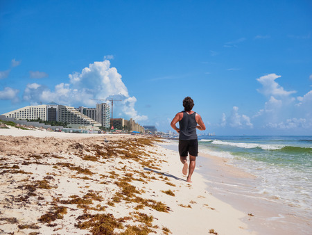 Young man jogging on tropical beach paradise of Playa Delfines, Cancun, Mexico, September 7, 2018