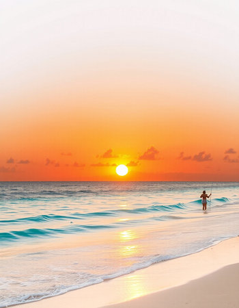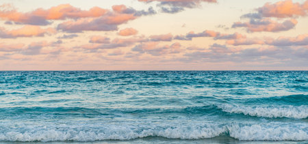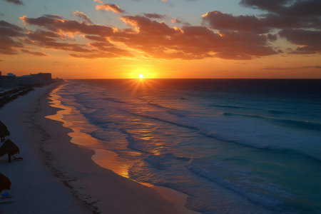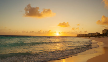 Gentle waves washing onto a pristine beach during a breathtaking sunrise in Cancun