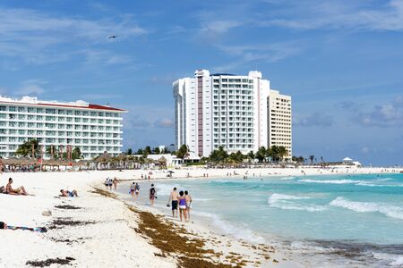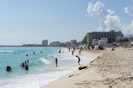 Mexico, Cancun - February 15, 2018: People relaxing and sunbathing on the beach. Cancun Grand Pyramid entertaining complex