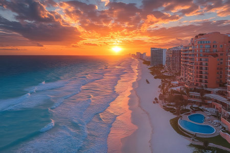This stunning image captures a beautiful sunrise over the beaches of Cancun, Mexico. The vibrant colors of the sky are reflected in the crystal clear waters of the ocean, creating a breathtaking scene. Perfect for travel or nature-themed projects.