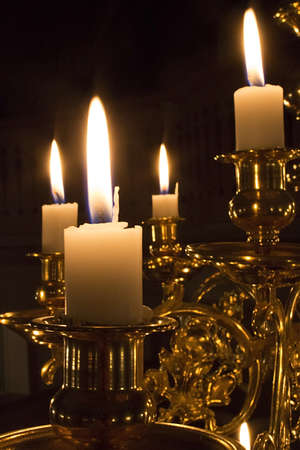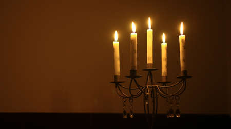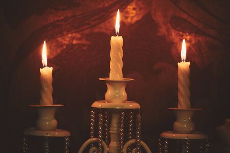 Burning candles oncandlestick against dark background at home. Vintage style. Calm romantic atmosphere. candles in the interior