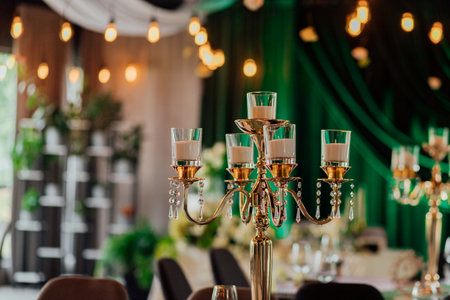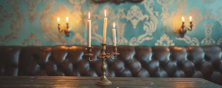 A captivating arrangement of ornate candleholders with glowing candles, set in a vintage-inspired interior, creating a warm and intimate ambiance perfect for celebrations.
