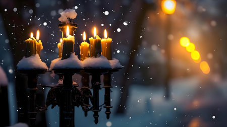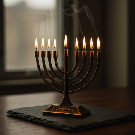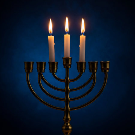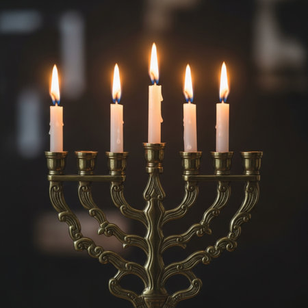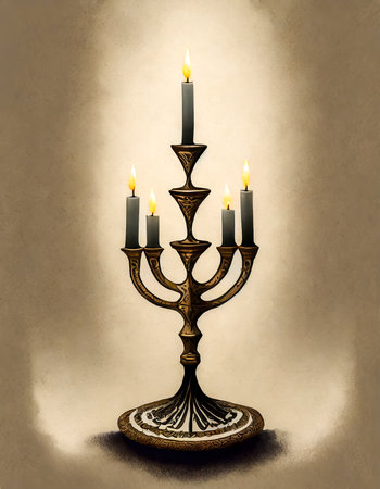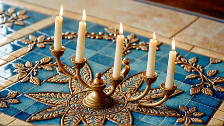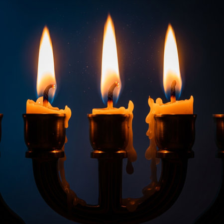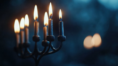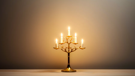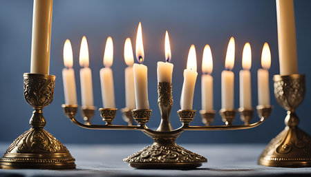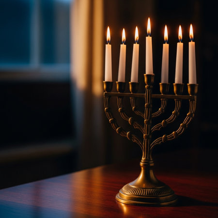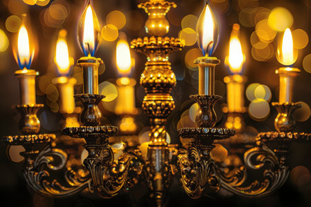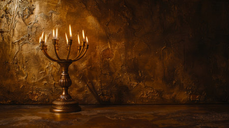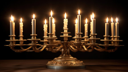 A beautifully ornate menorah stands with flickering candles, casting warm light in a dimly lit environment, evoking a sense of tradition and celebration.
