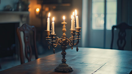 An intricately designed menorah with several lit candles stands proudly on a rustic wooden table. The atmosphere is warm and inviting, with a softly blurred, textured background.