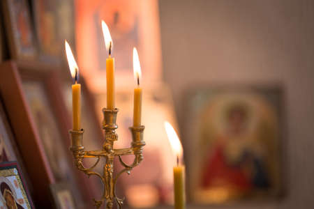 Praying wax candles in orthodox church or temple for ceremony easter. Background burning candles easter burn in orthodox temples. Concept of church backgrounds for creativity. Copy ad text space