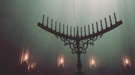 A grand menorah adorned with multiple candles captures the light in a dim, fog filled hall. The atmosphere is rich with anticipation, hinting at a spiritual celebration.