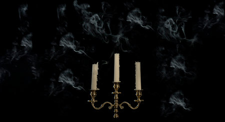 Elaborate black candelabra featuring seven lit candles, set against a dark, smoky, textured background, creating a dramatic and gothic atmosphere.