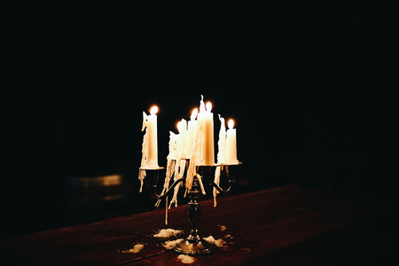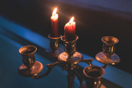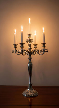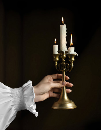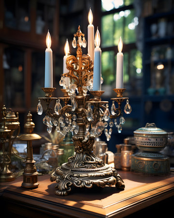 Burning candles on an antique candelabra, creating a warm, mystical ambiance.