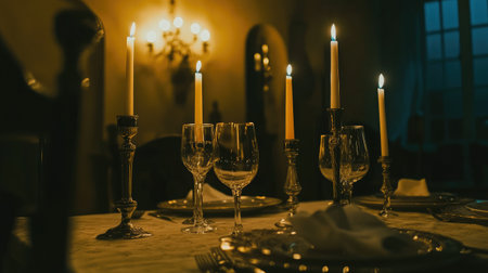 A beautifully arranged dining table illuminated by flickering candlelight, featuring elegant glassware and refined silverware, creating a cozy and inviting atmosphere for special occasions.