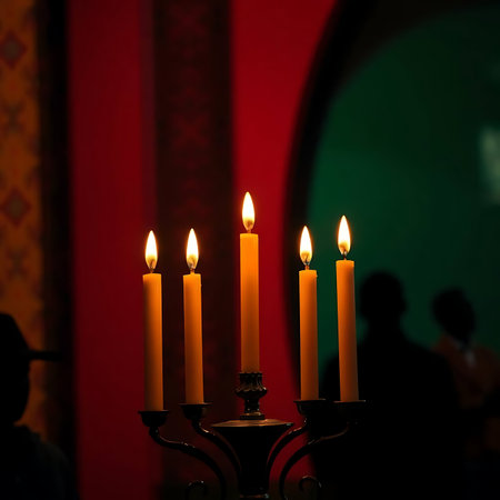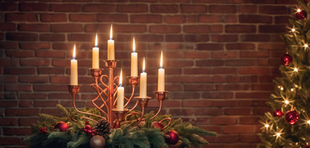 Soft candlelight from a decorative menorah creates a warm atmosphere in a dimly lit room, enhancing the festive spirit with floral elements nearby.