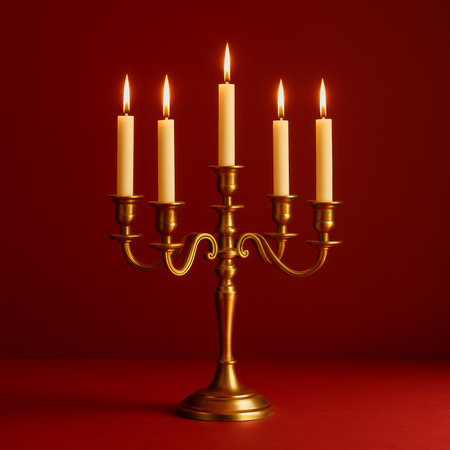 A beautifully styled brass candelabra featuring five lit candles against a red background
