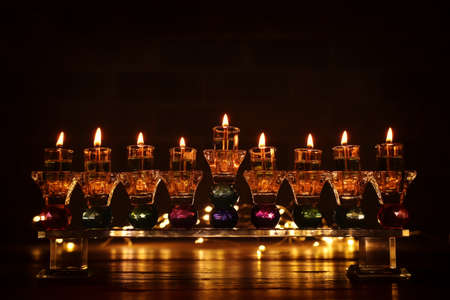 image of jewish holiday Hanukkah background with crystal menorah (traditional candelabra) and oil candles