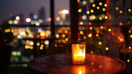 The soft sound of the crackling candles adds a soothing ambiance to the rooftop dinner making it feel like a private oasis in the bustling city. 2d flat cartoon