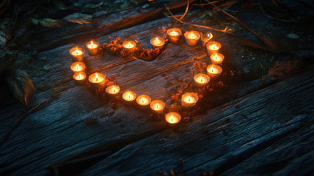A glowing arrangement of candles in a heart shape on weathered wood, with warm tones and soft shadows enhancing the mood. No people.