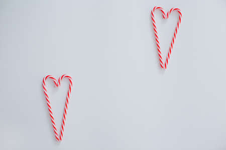 Heart shaped candy canes on a white background. Christmas concept with candy canes, copy space, place for text