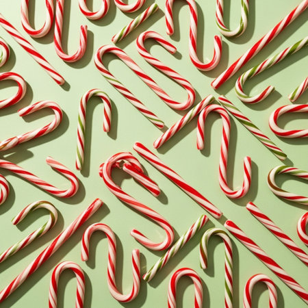 Christmas candy canes pattern on green background. Flat lay, top view