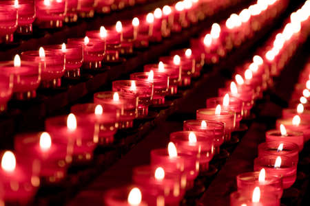 Group of red candles in church for faith resurrection prayer. Candlelight fire flames in rows are silent religion symbol for peace, life and soul. Obituary hope sacrifice against sorrows and pain.