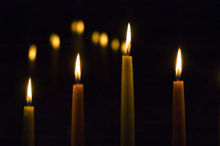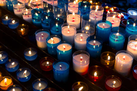 Close up of votive candles, twilight, in a dark Christian church. Selective focus
