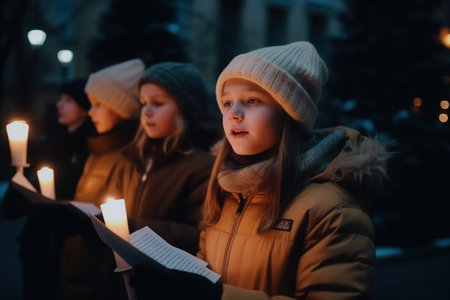 children sing carols near the Christmas tree on the street of the city at nigh