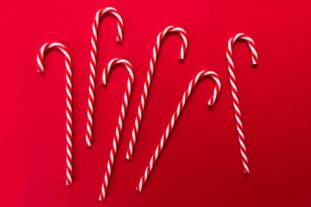 A lot of Christmas candies on a red background.