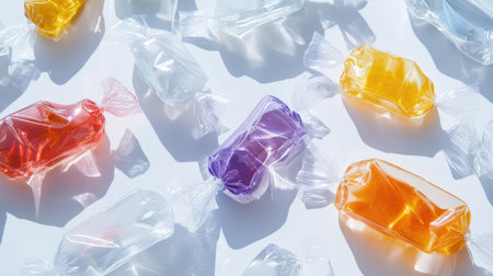 Vibrant hard candies wrapped in clear packaging, displayed in a random pattern on a white surface
