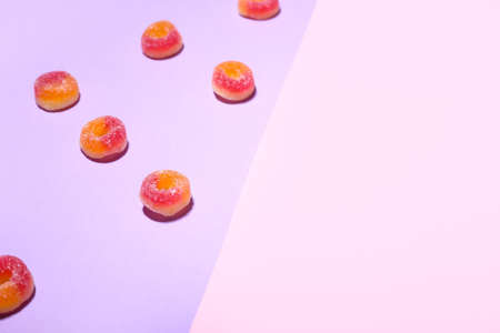 Tasty jelly candies on color background