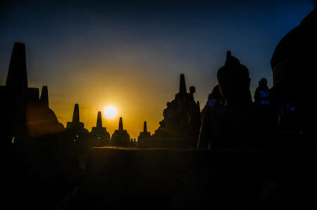 Borobudur temple, Indonesia - July 18, 2019: Tourists photographing the sunrise, thanks to which the silhouettes of the stupas and the surrounding landscape begin to be glimpsed.