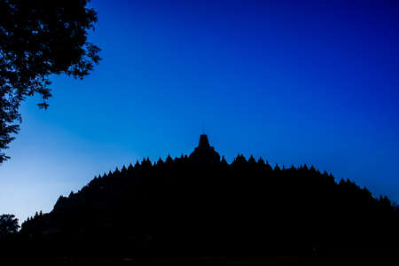 Silhouette Borobudur Temple with the mysteries forest surrounding at dawn, Yogyakarta, Indonesia