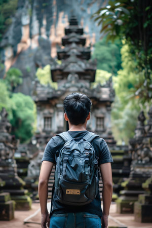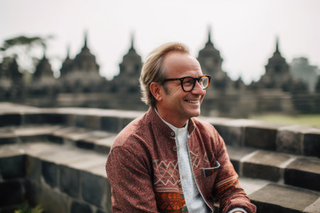 Handsome middle aged tourist man at Borobudur temple, Java, Indonesia