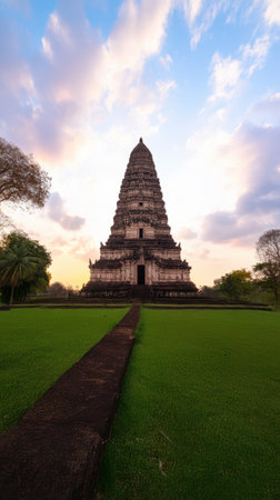 Sunrise over a Hindu temple with space for text in the sky. Dawn of a new day.