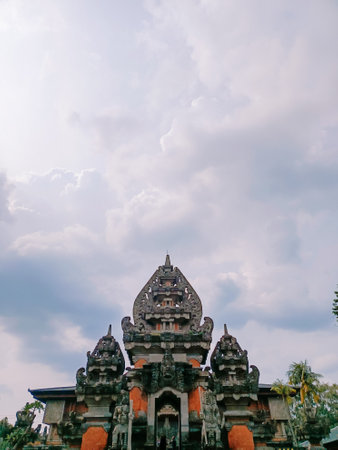 Jakarta, April 30 2024. A serene Balinese temple nestled within Taman Mini Indonesia Indah (TMII), radiating spiritual tranquility amidst Indonesia's cultural diversity